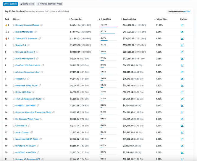 Scroll down on the etherscan gas page, and you’ll see the smart contracts that cause the most gas consumption. The pattern of gas consumption follows the Pareto principle (80/20 rule), 80% of the gas consumption comes from 20% of the ecosystem.